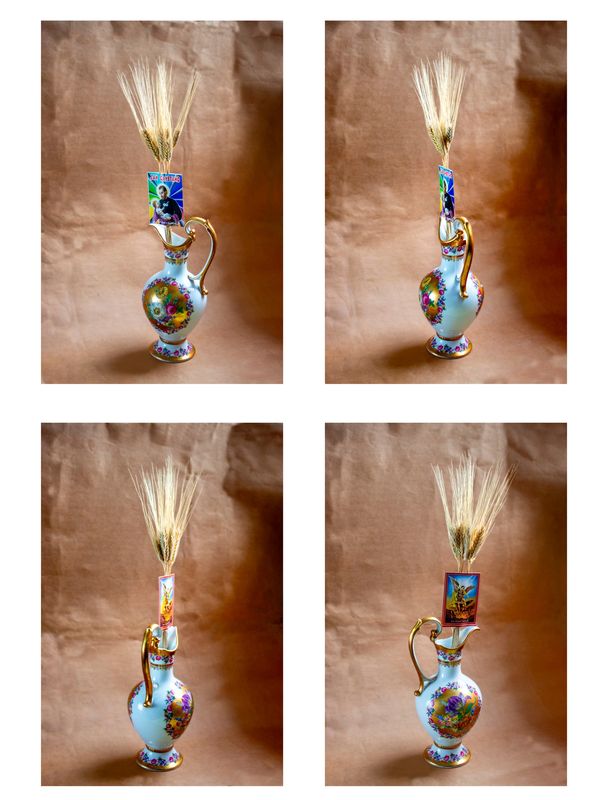 Obra compuesta por un antiguo jarrón de porcelana alemana Bavaria -con motivos florales, pintura al oro y una pequeña fractura en la boca- y espigas obtenidas en la última procesión a San Cayetano en Berazategui.
